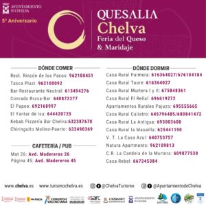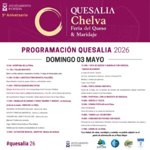 Desde el Ayuntamiento de Chelva comunicamos que ya está todo preparado para la celebración de la 5ª edición de Quesalia. La programación está cerrada y lista para disfrutar durante los próximos días 1, 2 y 3 de mayo.